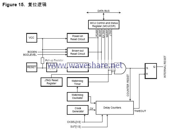 所有的复位信号消失之后,芯片内部的一个延迟计数器被激活,将内部复位的时间延长。这种处理方式使得在MCU 正常工作之前有一定的时间让电源达到稳定的电平。延迟计数器的溢出时间通过熔丝位SUT 与CKSEL 设定。延迟时间的选择请参见 P23“ 时钟源” 。