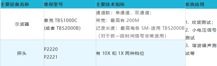 配置要求:针对纹波要求,信号频率不是很高,如果需要看高频谐波噪声可以适当提高带宽,100M带宽足够,探头配置需要等比例1:1探头即可。