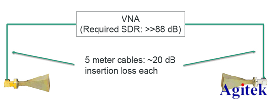 对于像远场天线这样的测试,由于源天线和测试天线之间的距离要求,存在很大的自由空间路径损耗。OTA损耗与接口电缆损耗加起来,使得VNA进行这些测量所需的动态范围非常高(如图2所示),这导致在OTA暗室应用中需要使用非常昂贵的高动态范围的VNA。