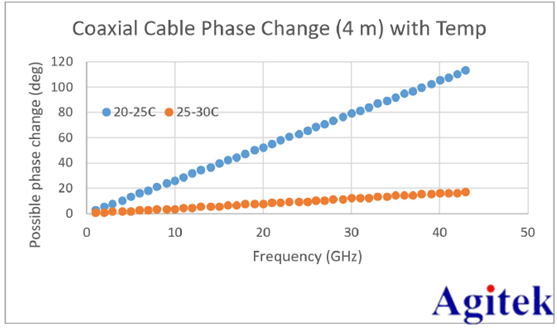 电缆可能产生的相位变化,如图3所示,该图阐述了四米同轴电缆在两个5摄氏度温度范围内的相位变化,即使在这些较小的温度范围内,相变也很明显。对于电缆长度通常较长且温度波动较大的户外应用来说,这种相变会更加严重。