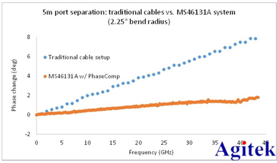 该图显示了两种相位随频率的变化。其中一条曲线是传统的VNA连接,它测量电长度较短的RF DUT,用2.25英寸半径弯曲的5米长电缆连接。如图所示,在40 GHz下大约有六度的相移。