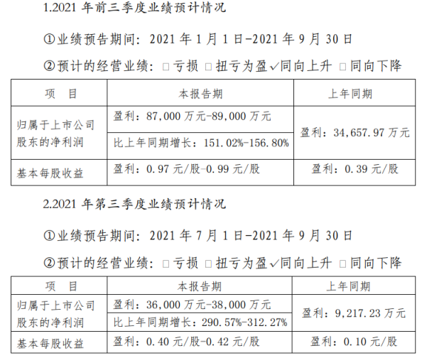 其中,预计7-9月实现归属于上市公司股东的净利润为3.6亿元-3.8亿元,同比增长290.57%-312.27%,上年同期盈利为0.92亿元。