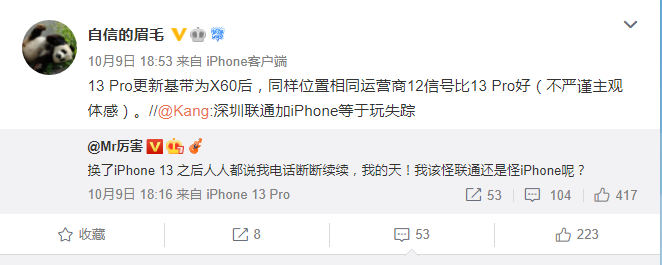 比较著名的微博大V@Mr厉害,官方认证为先看(深圳)科技创始人,其在10月9日发微博称,“换了iPhone 13 之后人人都说我电话断断续续,我的天!”