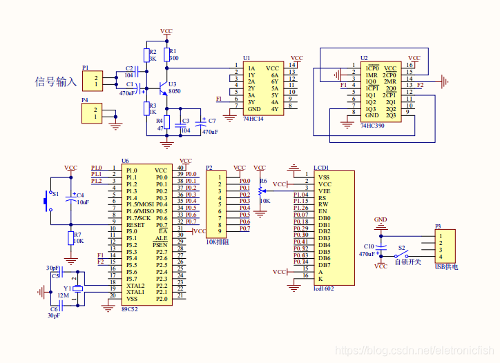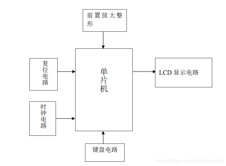 主要由51单片机+最小系统+分频模块+整形模块+lcd1602液晶显示+按键而成;如图: