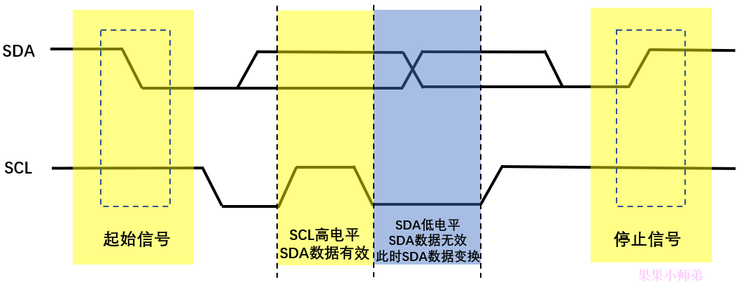 开始信号:SCL 为高电平时,SDA 由高电平向低电平跳变,开始传送数据。
