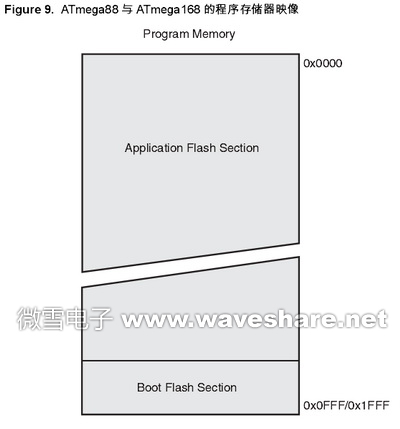 Flash存储器至少可以擦写10,000次。ATmega48/88/168的程序计数器(PC)为11/12/13位,因此可以寻址 2/4/8K 的程序存储器P234“Flash自编程, ATmega48” 与P240“Boot Loader支持RWW自编程,ATmega88 与ATmega168” 。而 P254“存储器编程” 详述了用SPI引脚接口实现对Flash数据的 串行下载。