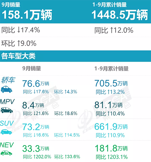 根据乘联会发布的最新数据显示,9月国内狭义乘用车销量为158.1万辆,与早前的7月和8月相比略有回升,然而因去年同期的对比基数为191.3万辆,是以同比跌幅仍继续扩大至达17.4%。