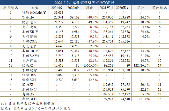 2021年10月14日 | 9月车型销量榜:特斯拉Model Y超长城H6成SUV冠军