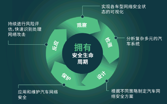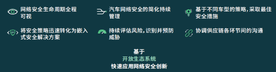 ·长周期:需要在网络安全生命周期中利用可视化网络安全管理来评估风险,分析潜在威胁,制定安全策略,并在一种或多种车型中充分实施。利用可视化网络安全状态,可以随时随地部署新的网络保护措施,还可以提前预测,快速创新。