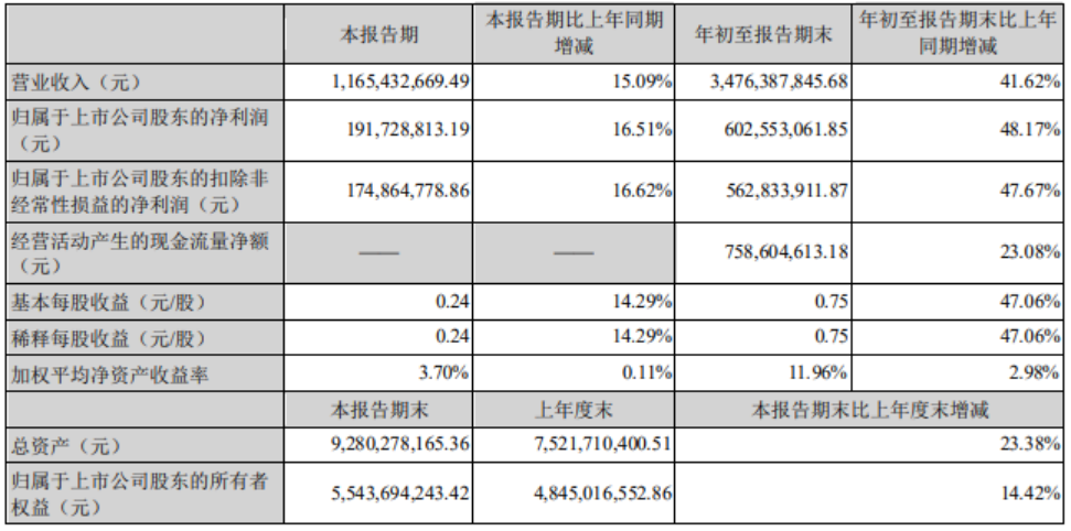 10月14日,顺络电子发布第三季度报告称,2021年7-9月,公司实现营业收入分别为11.65亿元,同比增长15.09%;归属于上市公司股东净利润为1.92亿元,同比增长16.51%。