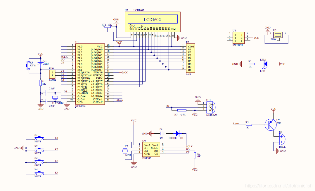 硬件主要由51单片机+最小系统+LCD液晶显示电路+DS1302时钟电路+蜂鸣器提示音电路+DS18B20温度采集电路+按键电路;
