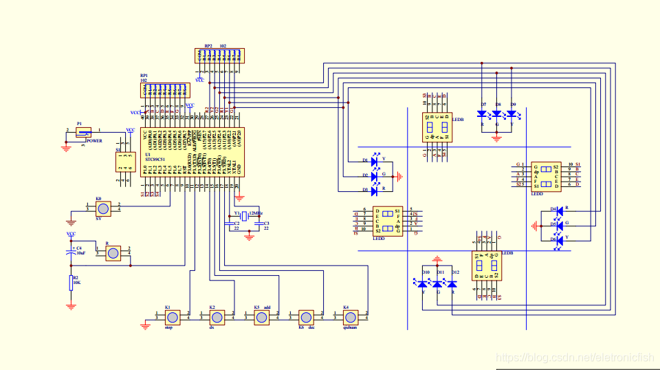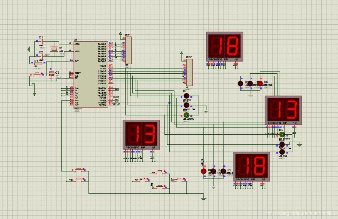 本设计能模拟基本的交通控制系统,用红绿黄灯表示禁行,通行和等待的信号发生,还能进行倒计时显示。按键可以控制禁行、深夜模式、复位、东西通行、南北通行、时间加、时间减、切换等功能。共四个二位阴极数码管,东南西北各一个显示时间,四个数码管的阴极都接到STC89C51的P1口,阳极接到74HC245芯片上,通过P0口控制74HC245芯片,起到驱动放大作用。