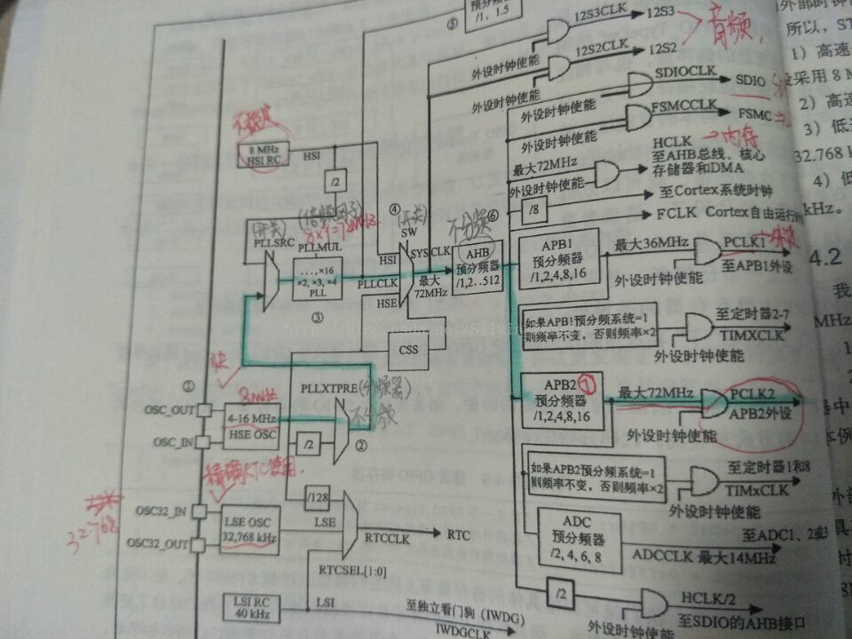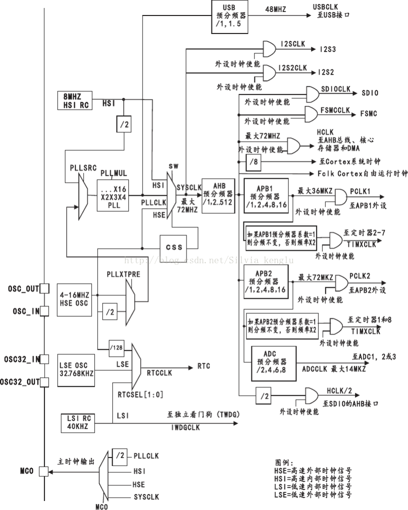 图一说明了STM32的时钟走向,从图的左边开始,从时钟源一步步分配到外设时钟。