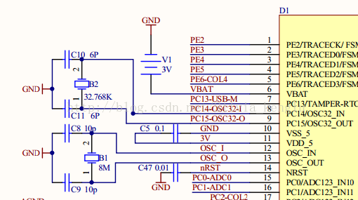 2)低速外部时钟(LSE):外部晶振作为时钟源,一般采用32.768kHz晶振,主要提供给实时时钟模块(RTC)。