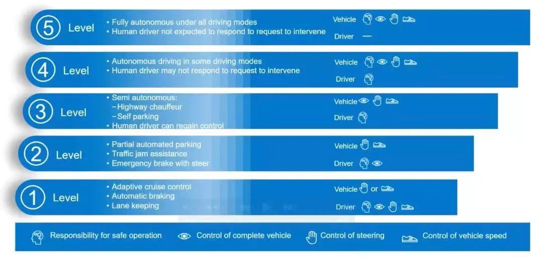 如果这些概念对于你仍然比较抽象,那么下面这张图展示得会更为直观。它将驾驶车辆的行为,分解成分别由手、脚、眼、脑完成的方向控制、加减速、观察环境、判断决策四个行为功能,明确标注出了不同级别中人和自动化系统的参与程度。