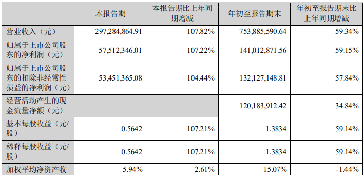 10月15日晚,四会富仕发布公告称,前三季度实现营收7.54亿元,同比增长59.34%;归属于上市公司股东的净利润为1.41亿元,同比增长59.15%。其中,第三季度营收2.97亿元,同比增长107.82%;归属于上市公司股东的净利润为5751万元,同比增长107.22%。