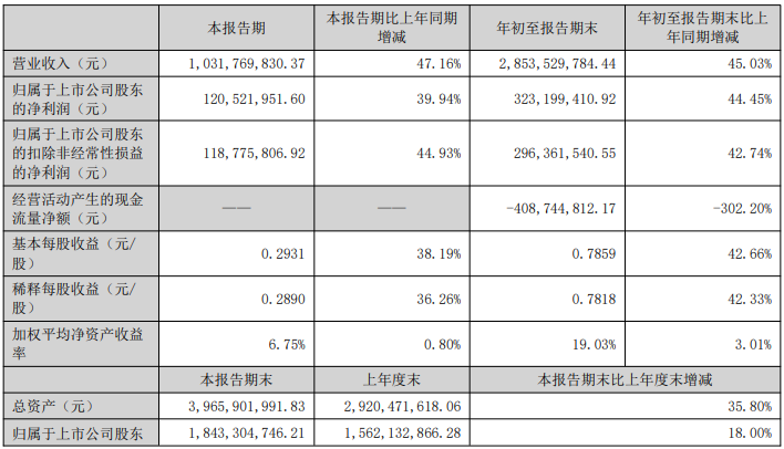 10月15日晚,广和通发布公告称,前三季度实现营收28.5亿元,同比增长45.03%;归属于上市公司股东的净利润为3.23亿元,同比增长44.45%。其中,第三季度实现营收10.32亿元,同比增长47.16%;归属于上市公司股东的净利润为1.21亿元,同比增长39.94%。