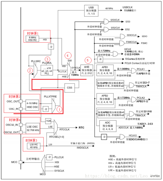 1:高速内部时钟HSI(4-16M),作为主时钟的输入信号源,可以在芯片外部接有源晶振或者无源晶振,我的开发板上使用的是8MHz的无源晶振作为外部时钟信号的来源。PLL通过时钟配置寄存器RCC_CFGR的第17位PLLXTPRE来控制HSI是否2分频后进入PLL时钟。