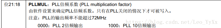 3:第(3)部份PLLMUL是设置PLL的倍频系数,最大输出不超过72M,最大16倍频。可通过RCC_CFGR的21:18来设置倍频系数。