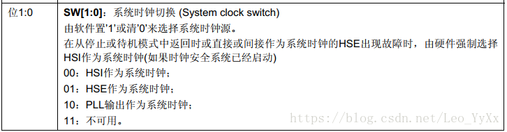 4:SYSCLK是系统时钟源选择。从图中我们可以看出SYSCLK的时钟来源可以是:HSI, PLLMUL,HSE,可以通过RCC_CFGR的1:0位来选择时钟源的输入。