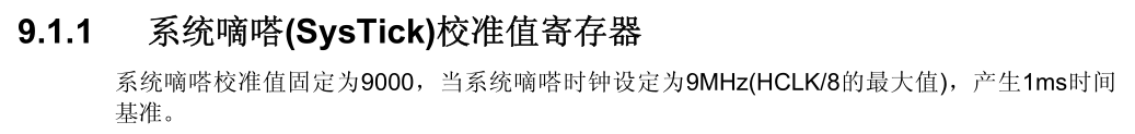SysTick是存在于stm32内核的定时器,嵌套在NVIC中,24位,只能递减。在stm32中文参考手册中,对于SysTick的描述其实很少,主要如下。systick的时钟可以为AHB时钟,或者是AHB时钟8分频=9M。而校准值固定为9000,也就是说,当时钟频率为9M时,9000的固定值对应1ms时间基准,9000 000对应1s时间。