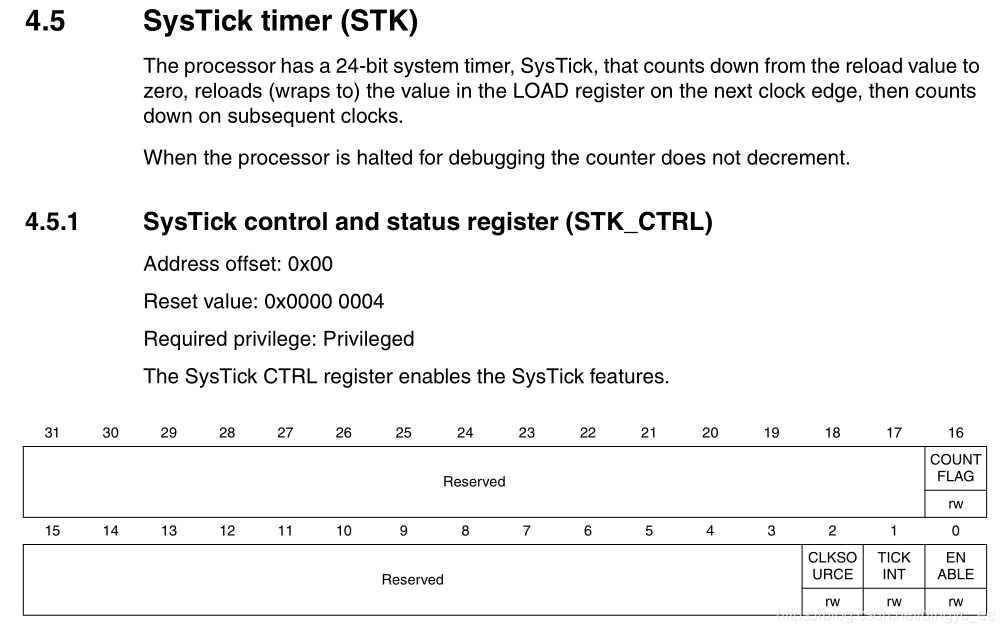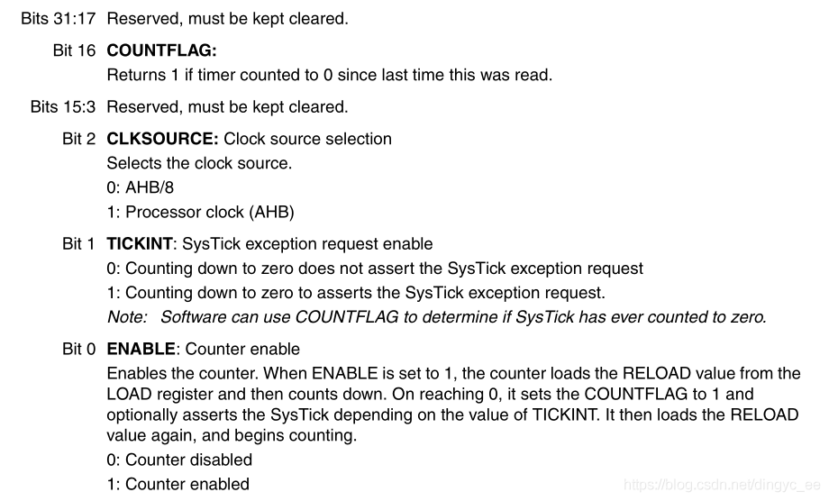 TICKINT:SysTick异常请求使能,该位为1则计数值减到0时发起系统异常请求,为0时不响应。