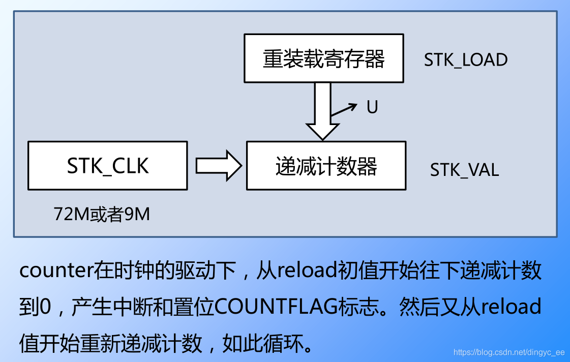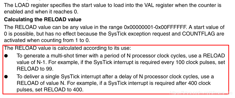 STK_LOAD重装载值寄存器,设置计数初值。值得注意的是,SysTick是减到0,一次完整的计数过程是0 - 99 - 98 -... -0共100个数,这是循环计数过程。因此,如果我们希望的计数值为N,实际上要写入到LOAD寄存器的值必须为N-1,这个非常重要。