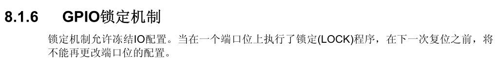 GPIO具有锁定机制,可以冻结该GPIO的配置,即在下次复位前,不能更改GPIO的配置。