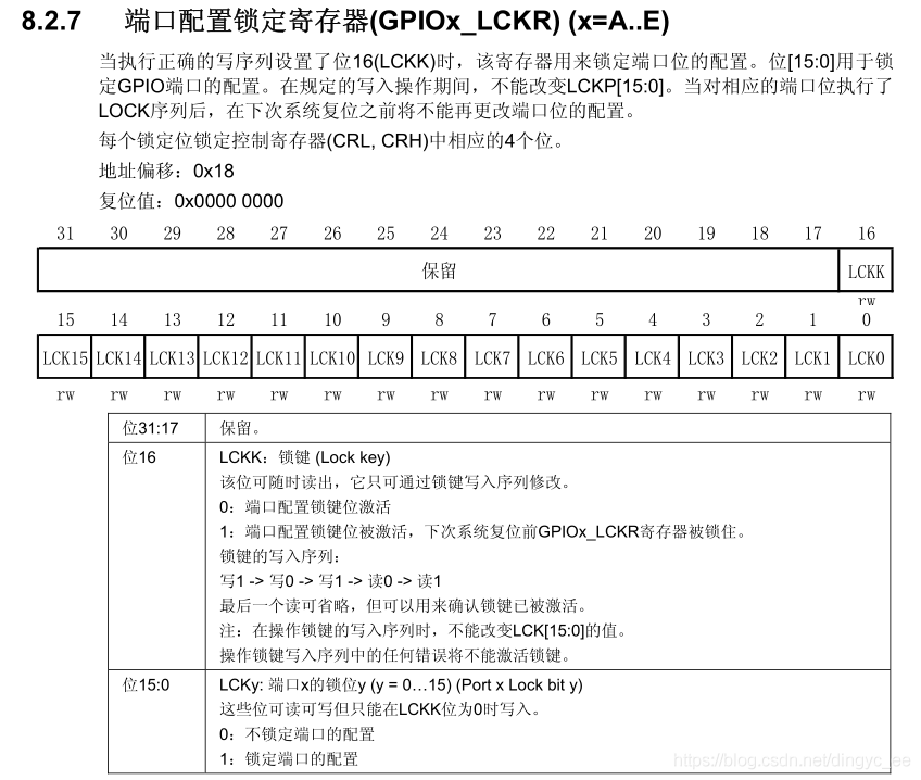 锁定操作的寄存器为GPIOx_LCKR,具体描述如下