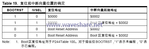 Table 19给出了不同的BOOTRST/IVSEL设置下的复位和中断向量的位置。如果程序永远不使能中断,中断向量就没有意义。用户可以在此直接写程序。同样,如果复位向量位于应用区,而其他中断向量位于Boot 区,则复位向量之后可以直接写程序。反过来亦是如此。