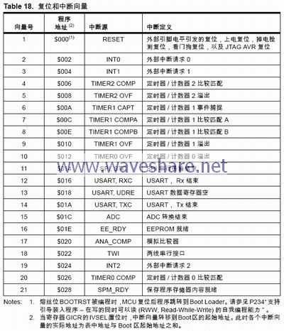 Note: 若中断向量位于Boot区,且Boot锁定位BLB02被编程,则执行应用区的程序时中断被禁止;若中断向量位于应用区,且Boot 锁定位BLB12 被编程, 则执行Boot 区的程序时中断被禁止。有关Boot 锁定位的细节请参见P234“ 支持引导装入程序 – 在写的同时可以读