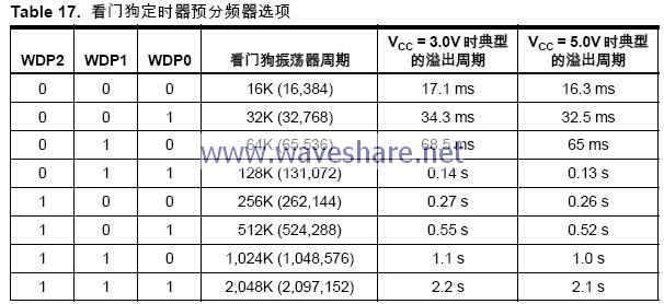 WDP2、WDP1 和WDP0 决定看门狗定时器的预分频器,如Table 17 所示。
