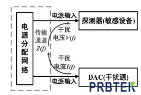 电源干扰传播特性分析从电磁兼容的角度来说,如果要保证敏感设备在受到干扰源干扰的情况下仍然可以正常工作,则应该满足:干扰源强度×通道衰减< 敏感设备的抗干扰能力。在电源干扰传播过程中,DAC 为干扰源,探测器为敏感设备,传输通道为两者之间的电源分配网络。