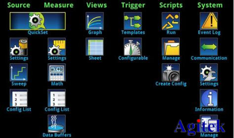 吉时利源表2450简化了非传统用户的学习曲线,使之从使用多层菜单结构和多功能按钮配置功能的繁琐工作中解脱出来。 2450型仪器使用基于图标的平面菜单系统,就像在智能消费电子产品中使用的菜单系统一样简单,如平板电脑或智能手机上显示的应用图标排列。