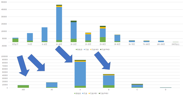1)之前我把渗透率在价格端做了一些分解,如果分级别再做细化整理的话,能体现出总体的格局状态:还是A00一枝独秀,同时在B级车取得了很大的突破。