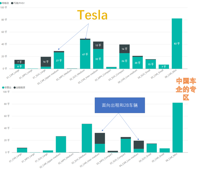 中国车企最成功的战略,也是目前最纯电车型大的市场,就是Mini Car这个类型,这块国外的车企是完全没办法做的。这类车型上个月8.32万台的上险量,占到纯电动市场的30.7%;除了这块,细分市场最大的是4.7万台的Model Y所在的市场,在这部分,特斯拉降价之后竞争力特别强;2.8万台的中高级轿车市场还有Model 3,这两款车型就强迫合资车企不得不降低利润;在中级轿车(4.4万台)和紧凑型轿车(2万台)所组成的传统合资车企比较占优势的细分市场,最大的需求是2B的出行市场,这也限制了合资车企的发挥;剩下还可以数得出来就是紧凑SUV市场,这4万台里面其实德系表现不错了,还有小型SUV市场目前还没覆盖到;中大型SUV目前是靠PHEV来做,这块合资车企也没有太多的建树。