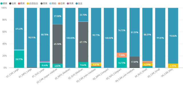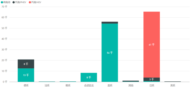 从外资品牌来看,特斯拉在Model 3和Model Y两个细分市场分别干到了65%-67%的市场份额,形成了压制的态势,其他就靠德系车在大型PHEV轿车市场、纯电动紧凑型SUV和中大型SUV市场找到存在感。