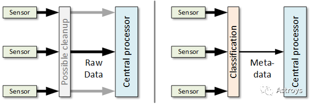 图2:左边是传感器数据直接送到中央处理器的情况,要么完全是原始数据,要么经过一些小的数据清洗。它可能通过单一的连接到zonal控制器,或直接到中央处理器。在右边,传感器数据在zone内进行本地分类,元数据被发送到中央处理器。(来源:Bryon Moyer)