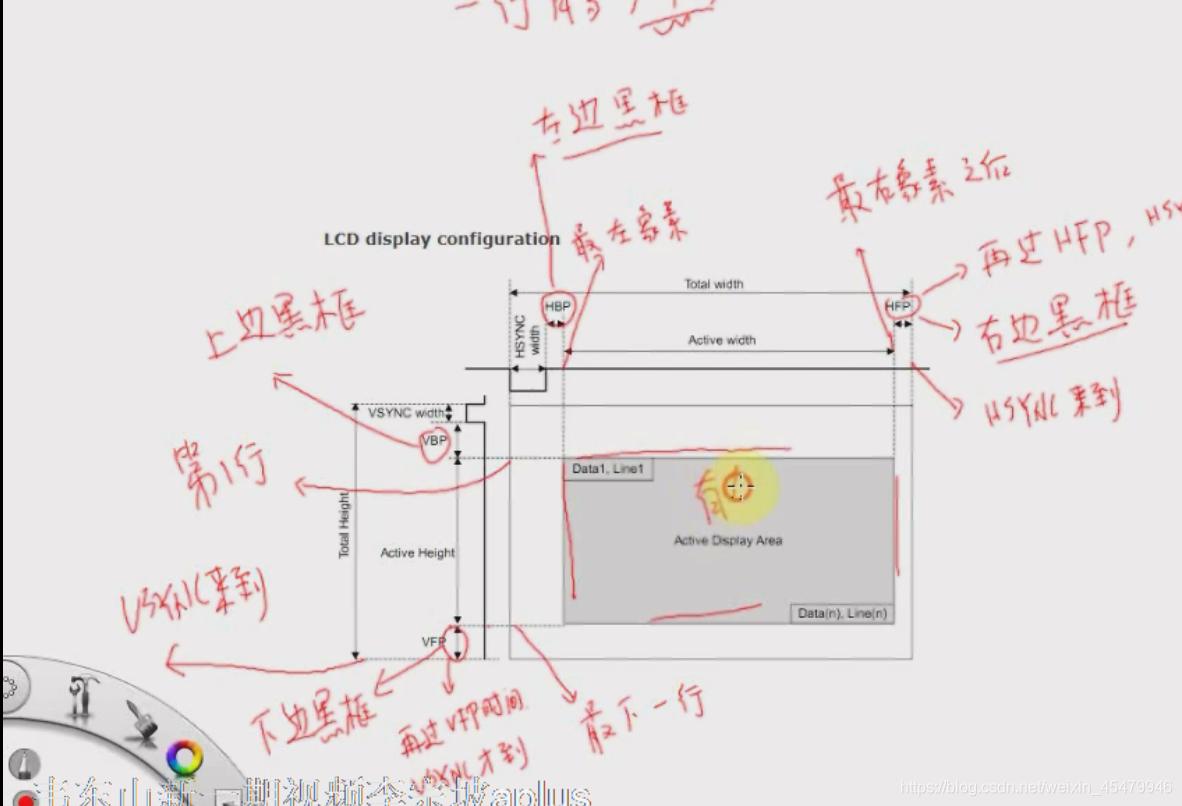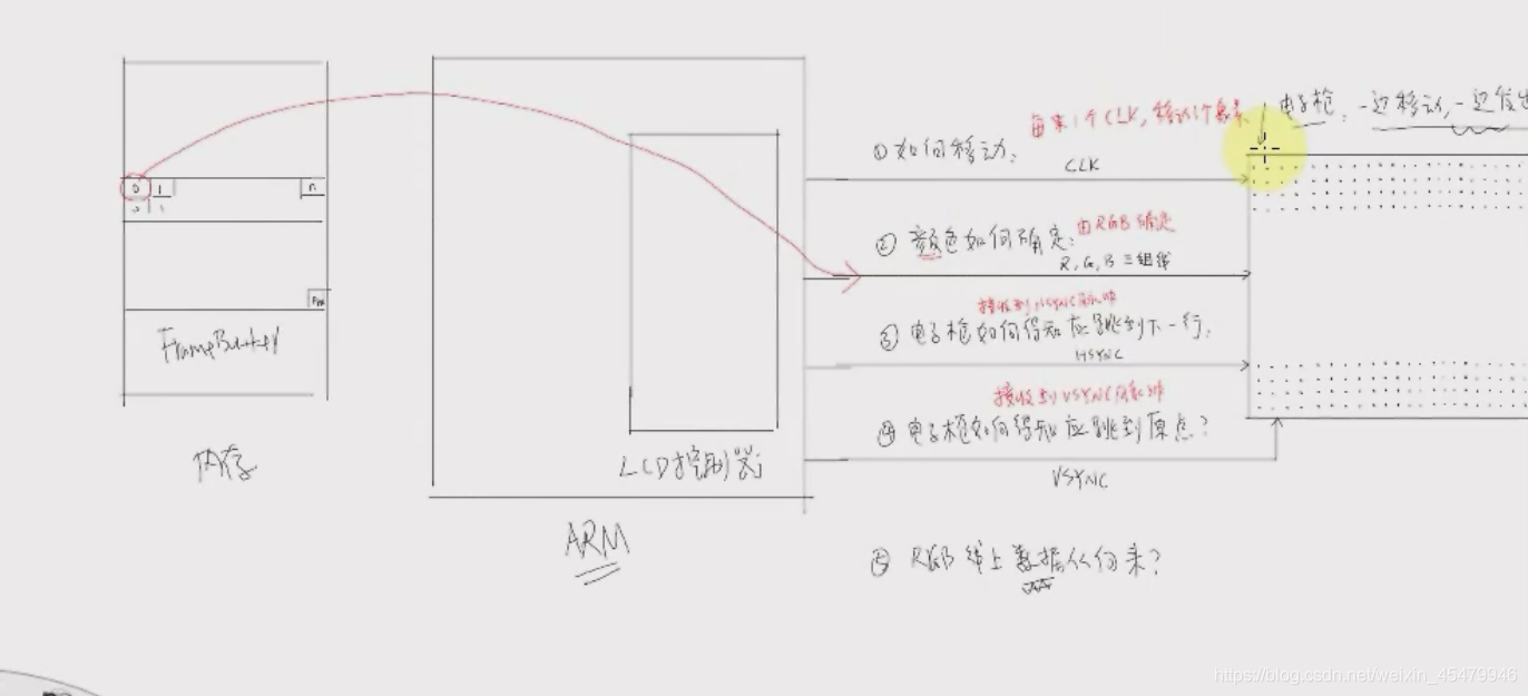 如下图,左边是内存,右边是控制器内部,我们的目的就是要通过控制LCD控制器的寄存器,让他发出合适的时序,实现数据的传输。