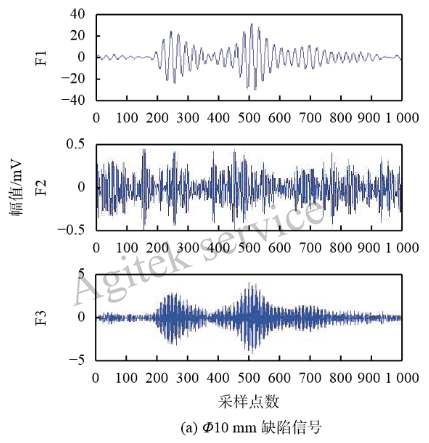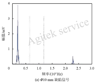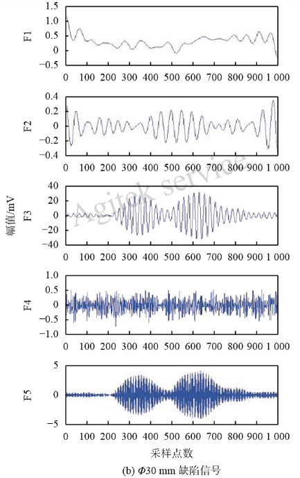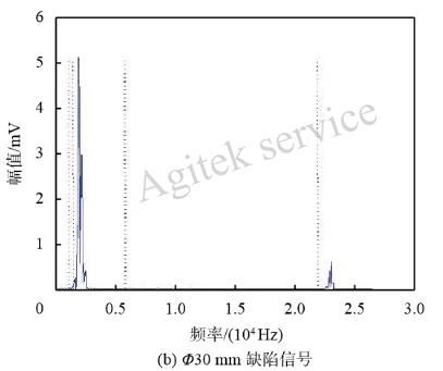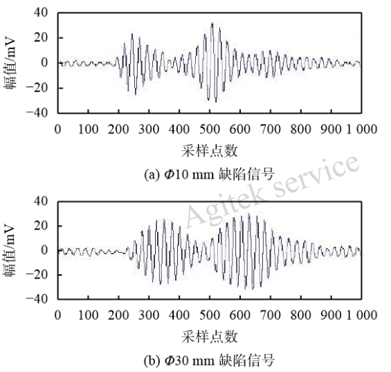 利用信号发生器产生频率为100KHz的正弦信号作为激励信号,经功率放大器放大后输出电压40Vpp,输出阻抗为低阻50Ω,检测时,将一对干耦合探头置于缺陷的两端,间距不变,并通过质量块加压固定,依次在10mm及30mm缺陷区域采集Lamb波检测信号,传统的超声波检测中,通常根据不同状态下时域信号幅值的差异来判断缺陷的存在与否,但从下图中可以看出,两个信号幅值相近,简单的根据幅值变化无法区分出缺陷大小。检测到的Lamb波均含有多种波包,且形状、数量不同,且不同程度的混叠在一起,需要对它的模态进行分解。