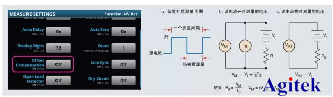 偏置补偿是在测量低电阻(一般低于10Ω)时用来消除热电压误差的一种技术。它通过提供电流,测量得到的电压,然后使用欧姆定律计算未知电阻,来测得电阻。