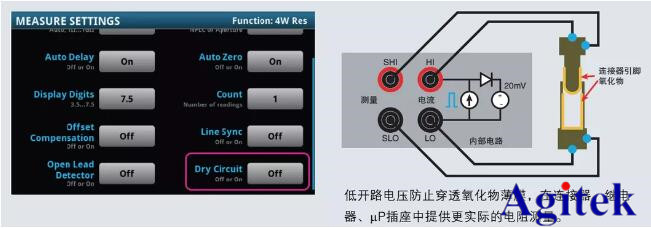 干电路电阻把开路电压限定在20mV(典型电平约为6~14V,具体视量程而定),以最大限度地减少被测接点中的物理变化和电气变化。这种低开路电压不会穿透薄膜,因此提供的电阻测量会包括氧化物薄膜的电阻。干电路电阻只能用于4W功能的1Ω、10Ω、100Ω、1kΩ和10kΩ量程中(最大电阻2.4kΩ)。