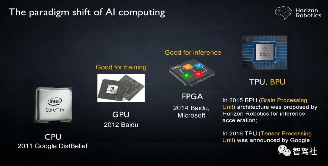 对于自动驾驶人工智能,最广泛使用的是什么芯片(图形处理单元(GPU)、现场可编程门阵列(FPGA)、特定应用集成电路(ASIC)或中央处理单元(CPU)?CPU是具有线性结构的通用处理器。理想情况下,最好是将CPU用于更一般(但重要)的非AI任务。如果可能的话,应该避免人工智能处理对CPU的超载。传统上,GPU被用于图形和游戏。然而,由于其灵活性和相对较高的处理能力,它可以用于人工智能训练和边缘应用。还有其他问题,如GPU和CPU之间的数据传输最终成为系统的一大制约因素。GPU的其他主要缺点是功耗和成本。GPU主要用于云人工智能及其灵活性和可配置性能力。ASIC更适合于具有大型计算处理、低成本和电源效率要求的特定应用任务,如AI应用。在人工智能应用中使用人工智能专用协处理器(ASIC)正在成为主流,尤其是边缘应用。相信在未来,对于自动驾驶,会有专用的处理器和系统来服务,而不是基于GPU。