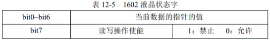 单片机读1602液晶的状态,是通过读取液晶里的状态字字节内容,来了解液晶内部情况,液晶状态字字节如下表12-5,