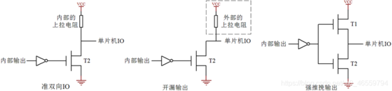 T1和T2为MOS管,靠电压导通的原件。(1)准双向IO口特点:内部输出为1,才能正常读取外部信号。(2)开漏输出特点:必须外加上拉电阻,不然单片机IO电平是个不确定的态。(3)强推挽输出特点:可输出或输入高电流,驱动能力强。(4)强阻态特点:状态取决与外部输入。 标准51单片机P0默认开漏输出。