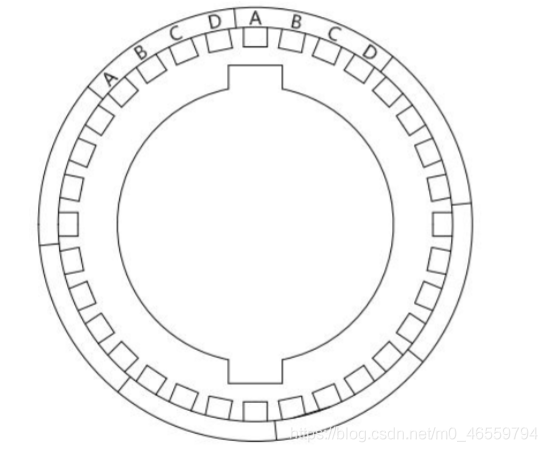 标注为0~5的齿叫转子,转子是一块永磁体,上带有永久磁性。外圈的齿为定子,图片上有8个,它是固定的。每个定子都绕了线圈绕组,正对的两个定子绕组是串联在一起的,这两定子组成一相。图中一共有A-B-C-D四相。