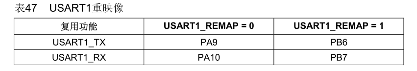 如串口USART1,下图所示。可以看到,REMAP=0(未开启重映射)即默认复用引脚为PA9 PA10,而当开启了重映射之后,TX和RX被重映射到PB6和PB7。重映射还有部分重映射(改变其中一些引脚分配)和完全重映射(改变所有引脚分配)。