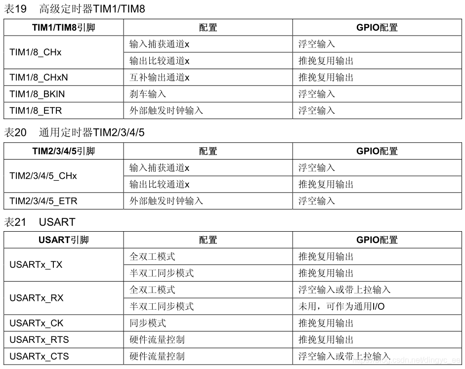 根据描述我们知道,在使用复用功能前,我们需要先配置对应的GPIO。具体配置的结构框图,也在“复用功能配置”中有说明。注意,在复用开漏模式下,读输入数据寄存器IDR可以得到IO口的状态,很明显,这在软件模拟IIC时,获得应答信号ACK非常有用。那么外设的GPIO具体应该怎么配置复用功能呢?在参考手册P110 8.1.11节有详细说明,所有外设的复用都能在这里查到。
