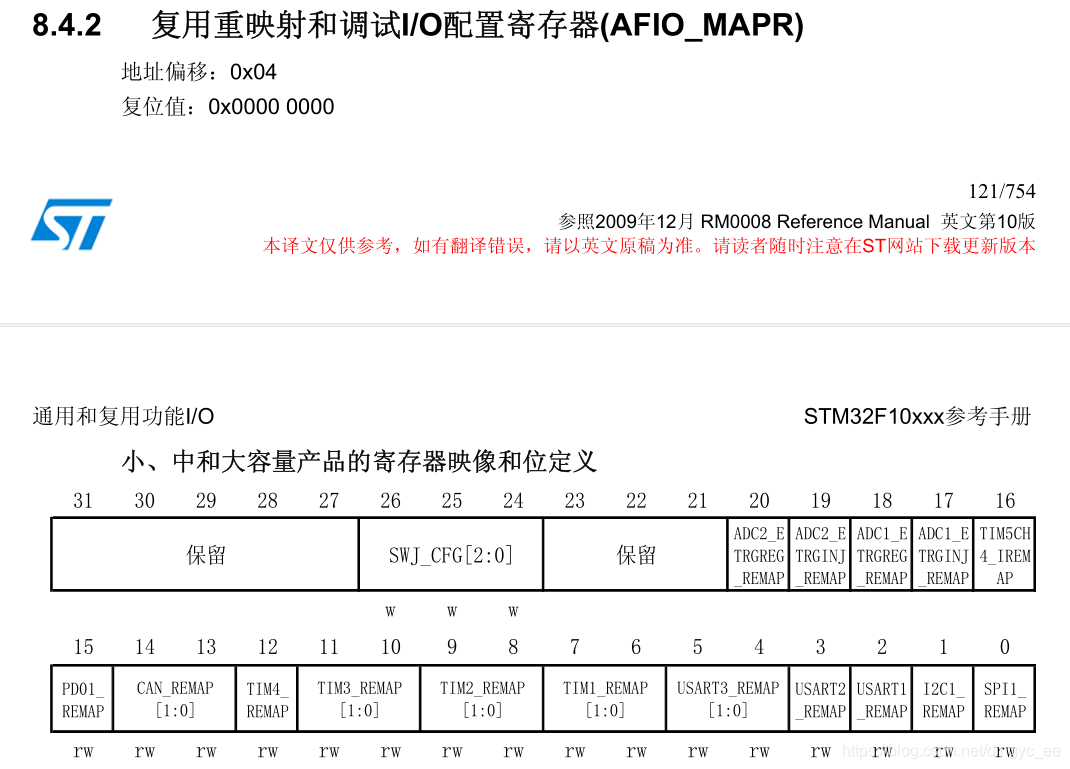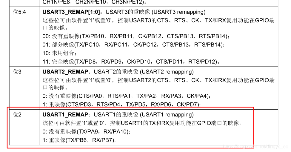 重映射实际上操作的是AFIO_MAPR寄存器,具体如下: