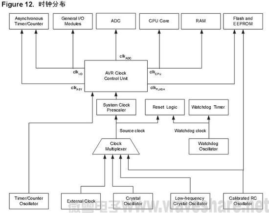 Figure12为ATmega48 的主要时钟系统及其分布。这些时钟并不需要同时工作。为了降低功耗,可以通过使用不同的睡眠模式来禁止无需工作的模块的时钟,详见 P32” 电源管理及休眠模式 ” 。下面为时钟系统的详细描述。
